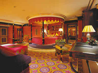 皇家套房大得嚇人,足有780平米,攤開來的話,面積相當于兩個籃球場。套房的設備更讓人咂舌,里面竟然有私家電梯和泳池。屋里的擺設都是世界各地的珍寶,睡床還能旋轉。讓人叫絕的是臥房的天花板上,裝有一面與睡床相映成像的大鏡子。
