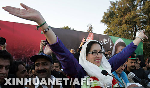 2007年12月27日,巴基斯坦前總理貝·布托在拉瓦爾品第參加競選集會。貝·布托在當天舉行的這個競選集會上遭炸彈襲擊身亡。 新華社/法新