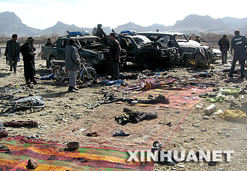 2月17日,警察和路人在阿富汗南部坎大哈市的爆炸襲擊現(xiàn)場查看。坎大哈省省長阿薩杜拉·哈立德說,當天上午發(fā)生在坎大哈市一個斗狗場的爆炸是自殺式襲擊事件,已經(jīng)造成至少80人死亡。 新華社/法新