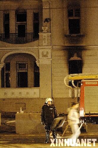 2月21日,在塞爾維亞首都貝爾格萊德,警察在被放火破壞的美國駐塞爾維亞大使館前警戒。當晚,集會抗議者闖入美國大使館,砸毀門窗,并在樓內放火。抗議者還攻擊了旁邊的克羅地亞使館。 新華社記者吳曉凌攝