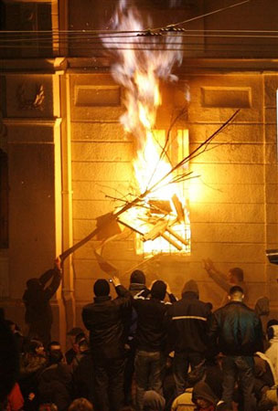 塞爾維亞抗議者襲擊美國使館。(圖片轉自:中國網)