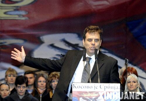 2月21日,在塞爾維亞首都貝爾格萊德,塞爾維亞總理科什圖尼察在抗議集會上發表講話。當天,貝爾格萊德舉行大規模群眾集會,抗議科索沃單方面宣布獨立。 新華社記者吳曉凌攝