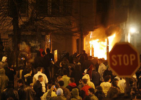 當天,貝爾格萊德舉行大規模群眾集會,抗議科索沃單方面宣布獨立。在集會期間,一些抗議者闖入美國使館,砸毀門窗,并在樓內放火。抗議者還攻擊了旁邊的克羅地亞使館。防爆警察用催淚瓦斯和警車驅散使館門前的抗議人群。有幾十名警察和民眾受傷。美國使館此前已經關閉,因此無使館人員受傷。