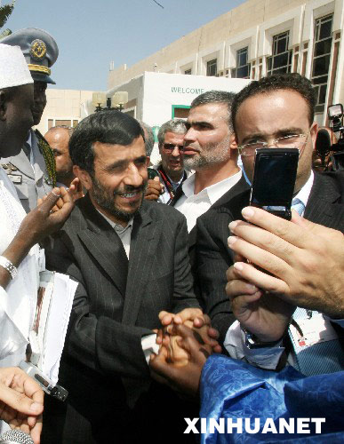 3月13日,在塞內(nèi)加爾首都達(dá)喀爾舉行的第11次伊斯蘭國(guó)家首腦會(huì)議開幕式上,伊朗總統(tǒng)艾哈邁迪-內(nèi)賈德(中)與支持者握手。 新華社記者王迎攝