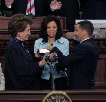3月17日,大衛(wèi)·帕特森在紐約州議會(huì)大廈攜妻子米歇爾(中),宣誓就任州長(zhǎng)。
