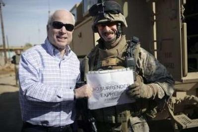 正在伊拉克訪問的麥凱恩與保護他的駐伊美軍少校合影。