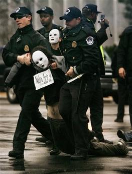 一名頭戴面具,飾演陣亡美軍士兵亡靈的反戰(zhàn)人士被警察帶走。