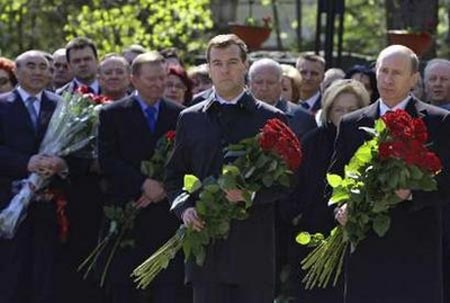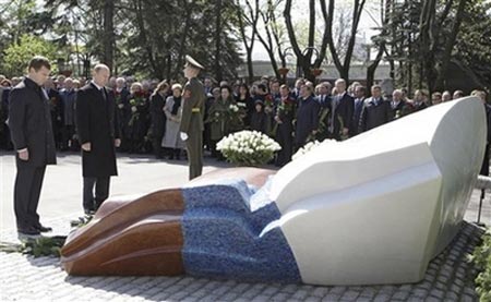 4月23日,俄羅斯總統普京、當選總統梅德韋杰夫,以及葉利欽家人出席俄前總統葉利欽墓碑落成儀式。(國際在線圖)