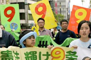 5月3日在日本憲法紀(jì)念日,民眾在東京舉行大游行,手持標(biāo)語(yǔ)主張維護(hù)和平憲法第九條規(guī)定。