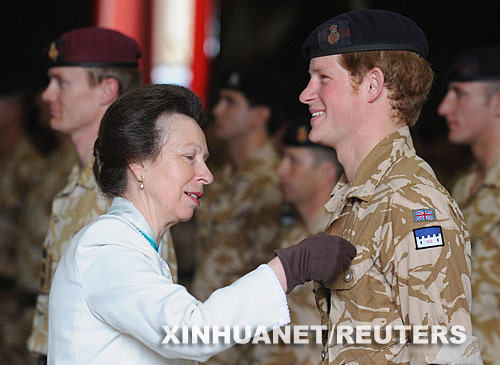5月5日,英國哈里王子(前右)在溫莎一個兵營接受安妮公主授予的服役勛章。據報道,哈里王子因在阿富汗前線的服役經歷獲得一枚勛章。 新華社/路透