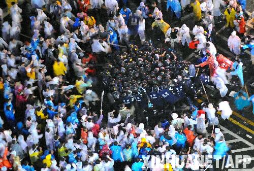6月29日,在韓國首都首爾,抗議人群將防暴警察圍在中央。 新華社/法新