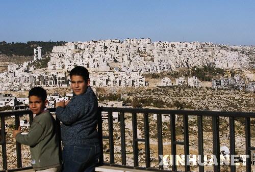 資料圖片:2007年12月12日,兩名巴勒斯坦男孩在約旦河西岸城鎮伯利恒的陽臺上,背后是猶太人定居點“霍馬山”(巴方稱“阿布格奈姆山”)。仍在擴建中的“霍馬山”定居點位于耶路撒冷和伯利恒之間,與伯利恒村莊的距離不到1公里。12月初,以色列住房和建設部招標在東耶路撒冷的“霍馬山”地區興建300套住宅。 新華社記者郭磊攝