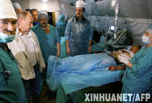 8月9日,在俄羅斯北奧塞梯共和國首府弗拉季高加索,俄總理普京(左二)來到野戰醫院看望在格魯吉亞南奧塞梯交火中受傷的傷員。普京于8日晚飛抵弗拉季高加索,召集會議討論南奧塞梯問題并會見了逃離南奧塞梯的難民。 新華社/法新