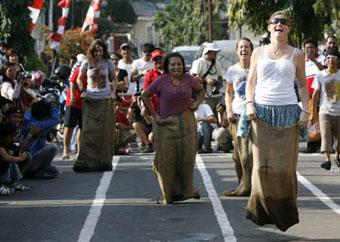 外國游客和當地老百姓一起進行套麻袋跑步比賽。