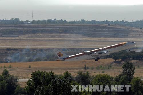 8月20日,一架伊比利亞航空公司飛機(jī)從西班牙馬德里機(jī)場(chǎng)的飛機(jī)失事現(xiàn)場(chǎng)附近飛過(guò)。當(dāng)日下午,西班牙航空公司的一架客機(jī)在馬德里機(jī)場(chǎng)起飛時(shí)沖出跑道并起火。新華社記者陳海通攝