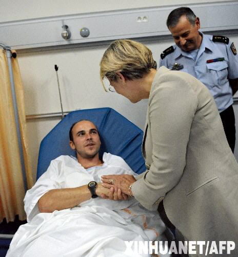 8月24日,法國內政部長米謝勒·阿利奧-瑪麗(前右)在薩朗什的一家醫院看望勃朗峰雪崩中的幸存者。歐洲最高峰勃朗峰在當日凌晨發生雪崩,目前造成至少8人受傷,10人下落不明。 新華社/法新 |