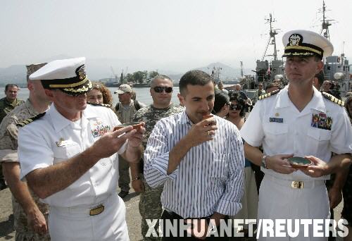 8月24日,在格魯吉亞黑海港口巴統,格國防部長克澤拉什維利(中)歡迎美國海軍導彈驅逐艦“麥克福爾”號艦長約翰·摩爾(右)和指揮官蒂莫西·肖爾(左)。當天,載有約80噸人道主義救援物資的“麥克福爾”號抵達格黑海港口巴統。 新華社/路透 |