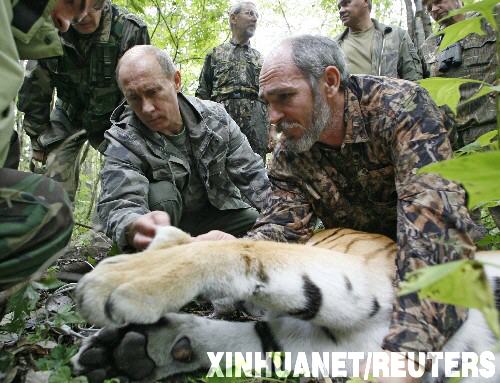 8月31日,在俄羅斯遠(yuǎn)東地區(qū),俄總理普京在科學(xué)家的幫助下為一只5歲的老虎戴上項(xiàng)圈。普京當(dāng)日訪問西伯利亞虎保護(hù)區(qū)時(shí),一只掉入陷阱的西伯利亞虎突然躥出,撲向附近的攝影師們,普京抓過一把用于麻醉的氣槍射擊,射中老虎肩胛處。虎中彈入睡后,普京親手為虎戴上裝備全球定位系統(tǒng)的項(xiàng)圈,以便科研人員監(jiān)控它的動(dòng)向和健康狀況。 新華社/路透