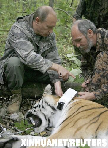 隨后,他在俄羅斯科學(xué)家維亞切斯拉夫·拉扎諾夫協(xié)助下,親手為虎戴上裝備全球定位系統(tǒng)的項(xiàng)圈,以便科研人員監(jiān)控它的動(dòng)向和健康狀況。