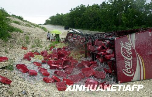 9月2日,在距離海地首都太子港約171公里的戈納伊夫附近,人們在公路旁收拾因熱帶風暴“漢娜”翻倒的貨車上的貨物。熱帶風暴“漢娜”1日升級為颶風,2日減弱為熱帶風暴襲擊海地,已在當地造成至少19人死亡。 新華社/法新