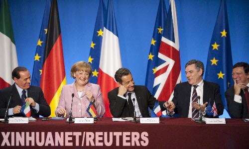 資料圖片 10月4日,意大利總理貝盧斯科尼、德國(guó)總理默克爾、法國(guó)總統(tǒng)薩科齊、英國(guó)首相布朗和歐盟委員會(huì)主席巴羅佐(從左至右)參加在法國(guó)首都巴黎的愛(ài)麗舍宮舉行的聯(lián)合記者招待會(huì)。當(dāng)日,法國(guó)、德國(guó)、英國(guó)和意大利的領(lǐng)導(dǎo)人在巴黎召開會(huì)議,尋求共同應(yīng)對(duì)金融危機(jī)的對(duì)策。 新華社/路透