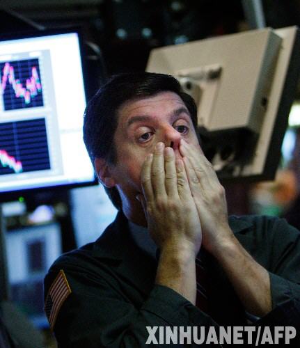 10月7日,一名交易員在美國紐約股票交易所。由于對信貸危機加深的恐慌導致投資者持續拋售股票,當日紐約股市連續第五天下挫,標準普爾指數五年來首次跌破1000點。道瓊斯指數和標普今年已分別下跌了29%和32%,創1937年以來之最。 新華社/法新
