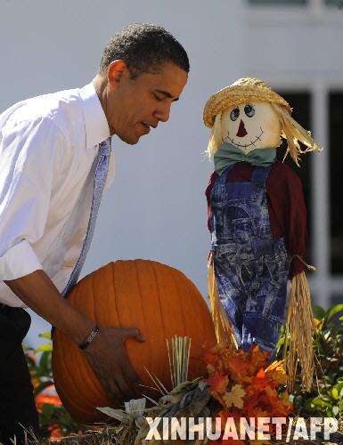10月30日,在美國佛羅里達州的薩拉索塔,選戰(zhàn)中四處奔走的美國民主黨總統(tǒng)候選人奧巴馬忙里偷閑,來到當(dāng)?shù)氐囊患夷瞎蠄@摘南瓜,享受片刻悠閑。 新華社/法新 |