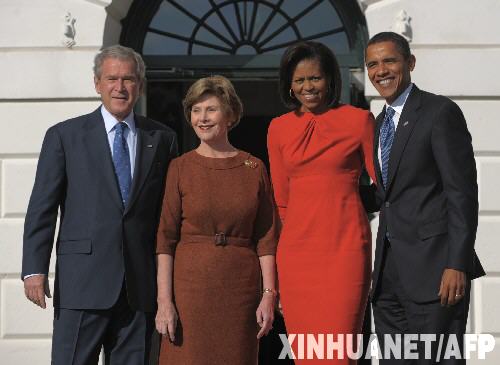 11月10日,美國當(dāng)選總統(tǒng)奧巴馬(右一)及其夫人米歇爾(右二)與美國現(xiàn)任總統(tǒng)布什(左一)及其夫人勞拉在美國白宮合影。奧巴馬當(dāng)日應(yīng)邀首次進(jìn)入白宮橢圓形辦公室會見布什,就經(jīng)濟(jì)危機(jī)和伊拉克戰(zhàn)爭等問題舉行會談,以確保政府順利過渡。 新華社/法新