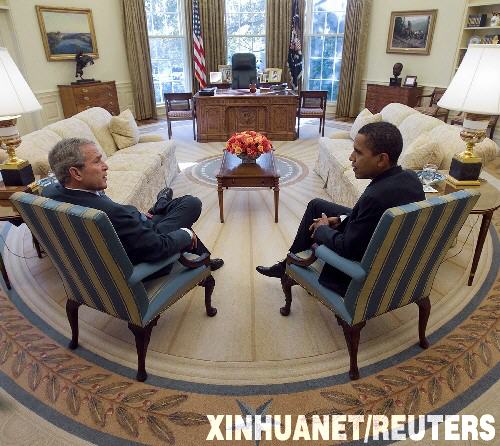 11月10日,美國當(dāng)選總統(tǒng)奧巴馬(右)應(yīng)邀首次進(jìn)入白宮橢圓形辦公室會見現(xiàn)任總統(tǒng)布什,就經(jīng)濟(jì)危機(jī)和伊拉克戰(zhàn)爭等問題舉行會談,以確保政府順利過渡。 新華社/路透