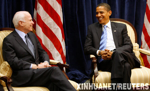11月17日,美國當選總統(tǒng)奧巴馬(右)與他在總統(tǒng)選舉中的對手麥凱恩在芝加哥舉行會談。會后雙方一致表示將攜手合作,共同應對金融危機和美國面臨的其他重大挑戰(zhàn)。 新華社/路透