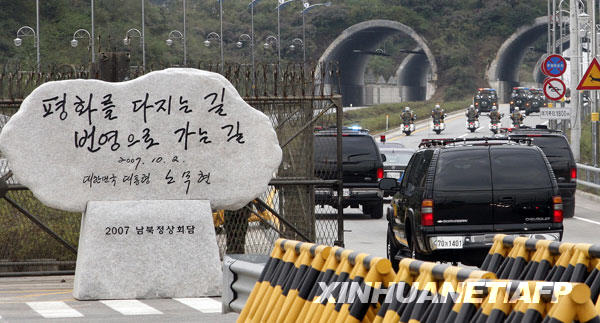 這是2007年10月3日韓國前總統(tǒng)盧武鉉的車隊穿過軍事分界線的資料照片。 11月12日,朝韓將軍級會談朝鮮代表團團長正式通知韓國軍方,將從12月1日起采取“重大的實際措施”,切斷經由朝鮮半島軍事分界線的所有陸路通道,嚴格限制通行。 新華社/法新