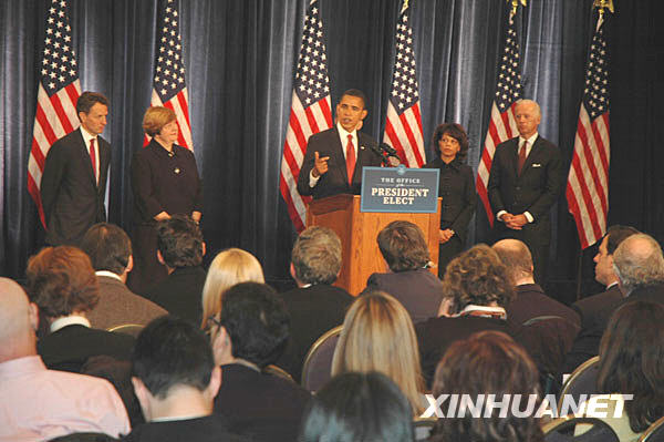 11月24日,美國當選總統奧巴馬(中)在芝加哥舉行的新聞發布會上發表講話。奧巴馬當天召開新聞發布會,正式提名新政府經濟團隊主要成員,其中包括財政部長、國家經濟委員會主任和白宮經濟顧問委員會主任等人選。 新華社記者 韓萬寧攝