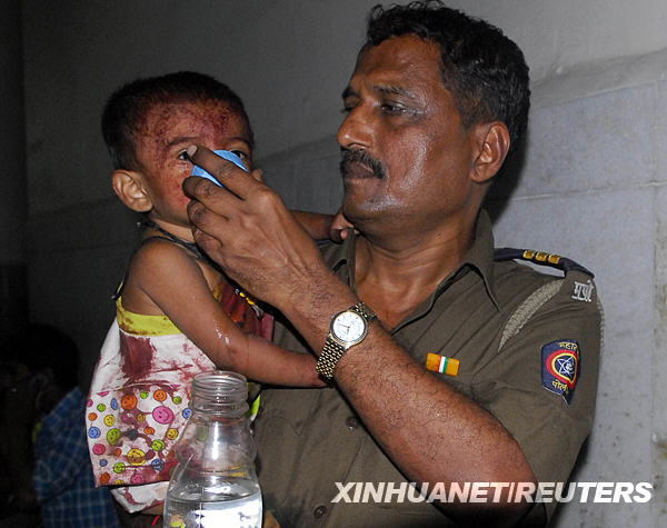 11月26日,一名警察在印度孟買一所醫院安撫一名在襲擊中受傷的兒童。新華社/路透