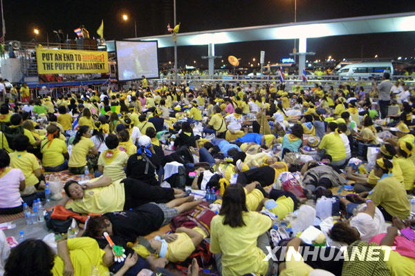 11月26日,泰國反政府人民民主聯(lián)盟成員繼續(xù)在泰國首都曼谷素萬那普國際機(jī)場集會(huì)。當(dāng)天,因泰國反政府人民民主聯(lián)盟示威集會(huì)而自25日晚間關(guān)閉的素萬那普國際機(jī)場依舊保持關(guān)閉狀態(tài),大量乘客滯留。新華社記者 凌朔攝