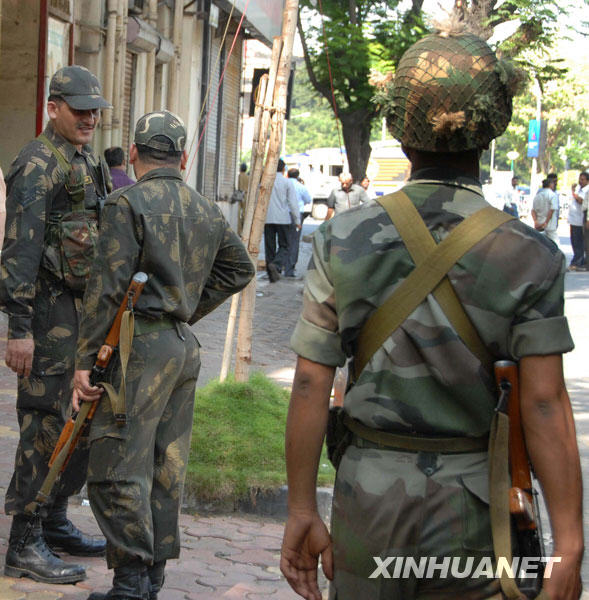 11月27日,幾名軍人在恐怖分子控制的印度孟買戈拉巴市場附近警戒。新華社發