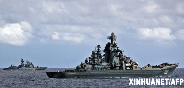 12月2日,在委內瑞拉境內的加勒比海域,俄羅斯“恰巴年科海軍上將”號大型反潛艦(左)與“彼得大帝”號核動力導彈巡洋艦參加委內瑞拉和俄羅斯舉行的海上聯(lián)合軍演。新華社/法新