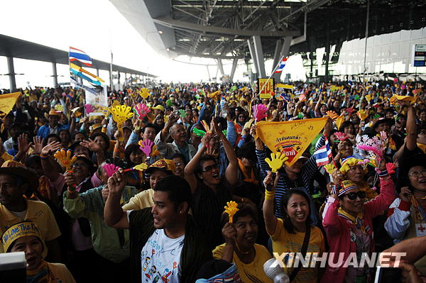 12月3日,泰國反政府的人民民主聯盟(民盟)支持者在曼谷素萬那普國際機場載歌載舞。新華社記者凌朔攝