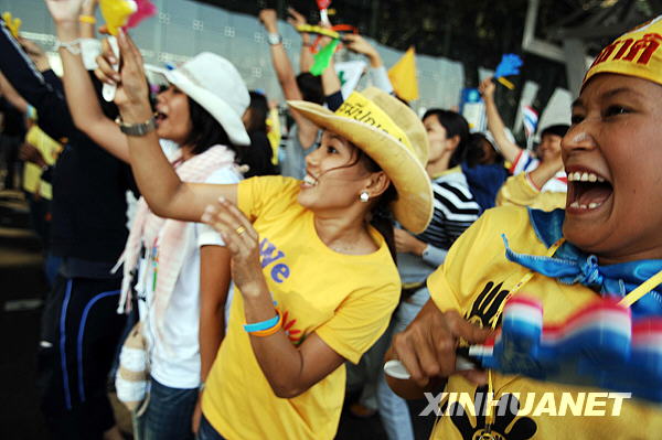12月3日,泰國反政府的人民民主聯盟(民盟)支持者在曼谷素萬那普國際機場載歌載舞。當天,民盟結束對總理府和曼谷兩座機場的占領,宣稱推翻頌猜政府的目的已經達到,所有反政府集會全部停止。新華社記者凌朔攝