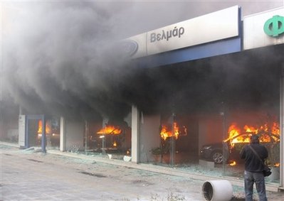路透社援引當地警方的話報道,希臘各地的沖突已致使至少34人受傷,20人被捕。雅典市中心商業區超過30家商店和數十輛汽車遭到焚毀,警方為控制局勢而出動了直升機。
