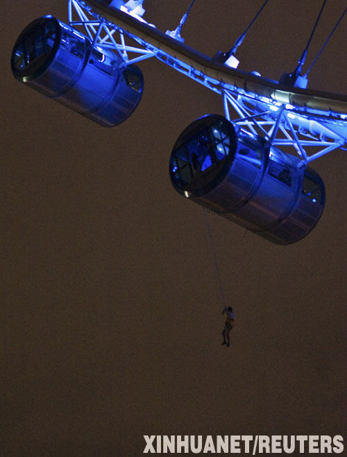 12月23日,工作人員用繩索轉移一名被困在新加坡摩天觀景輪座艙中的游客。有世界最高摩天觀景輪之稱的“新加坡飛行者”當日發生技術故障,100多名游客被困于高空6小時。 新華社/法新