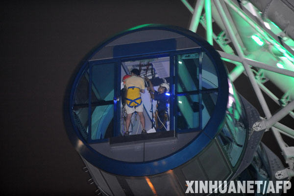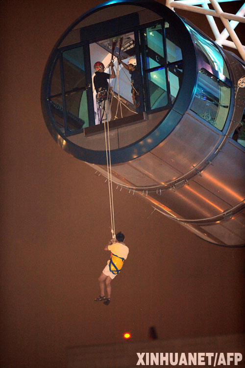 12月23日,工作人員用繩索轉移一名被困在新加坡摩天觀景輪座艙中的游客。 新華社/法新