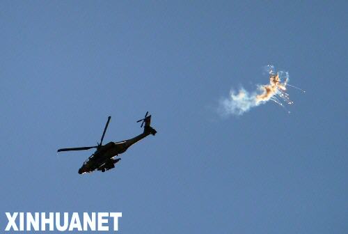 1月4日,一架以軍武裝直升機向在加沙地帶北部地區發射火箭彈。當日,以軍繼續對加沙地帶進行空中打擊,以配合地面進攻。新華社記者 殷博古 攝