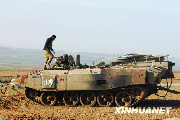 1月5日,在加沙北部邊境地區,以色列士兵在裝甲車上警戒。當日,以色列軍隊繼續地面進攻加沙地帶,并已將加沙地帶分隔成南北兩塊區域。以軍發動的“鑄鉛”軍事行動目前已造成巴勒斯坦方面514人死亡,約2600人受傷。新華社發(拉菲爾攝)