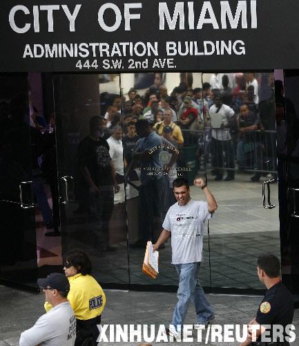 2月2日,在美國佛羅里達州的邁阿密,一名男子完成申請做消防員的手續(xù)后揮手慶祝。邁阿密市準(zhǔn)備新增35名消防員,并宣布只接受前750人的求職申請表。數(shù)百名申請者為能提交申請表在戶外排隊露營了三夜。 新華社/路透