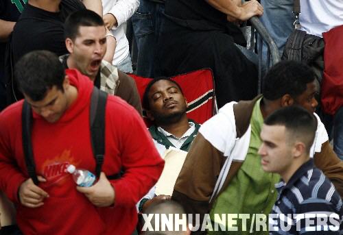 2月2日,在美國佛羅里達州的邁阿密,一名連夜排隊等待申請當(dāng)消防員的男子(中)坐在椅子上睡著了。邁阿密市準(zhǔn)備新增35名消防員,并宣布只接受前750人的求職申請表。數(shù)百名申請者為能提交申請表在戶外排隊露營了三夜。 新華社/路透