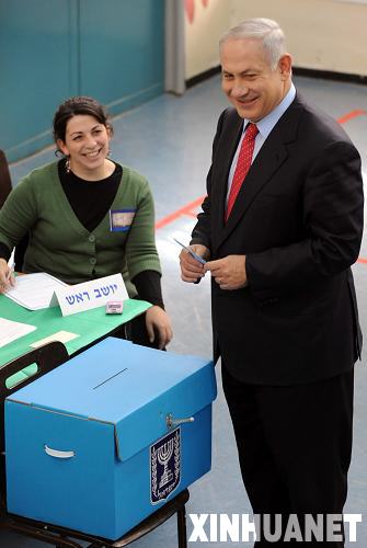 2月10日,以色列議會(huì)最大反對(duì)黨利庫德集團(tuán)主席內(nèi)塔尼亞胡(右)在耶路撒冷的一個(gè)投票站投票。新華社記者殷博古攝