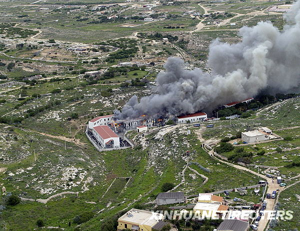 2月18日,在意大利南部蘭佩杜薩島,濃煙從一處移民收容中心升起。新華社/路透