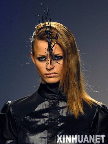 2月24日,在西班牙首都馬德里舉行的時裝周上,模特在展示設計師的時裝作品。在第49屆馬德里時裝周上,模特頭部的各種精心修飾使得時裝設計師的作品得到了更好的詮釋。 新華社記者陳海通攝