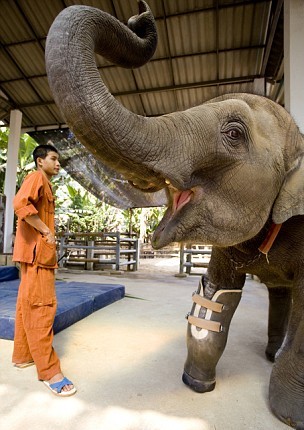 中新網(wǎng)3月10日電 據(jù)英國《每日郵報》報道,在泰國南邦府,一只亞洲象兩年前不幸觸雷后,前右腿慘遭炸毀。后來這只亞洲象安裝上假肢,不久將可重返叢林生活。