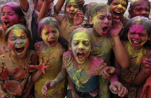 3月9日,印度加爾各答,人們在歡慶一年一度的傳統節日“Holi”節,這個節日是印度最盛大的節日之一,源于古人期盼豐收的活動,在每年2月至3月間舉行。節日里最有趣的慶祝方式式就是涂抹色彩了,人們會用手或類似水槍的工具把各種色彩的顏料涂在別人身上表示祝福,因此中文還把這個節日翻譯成灑紅節。